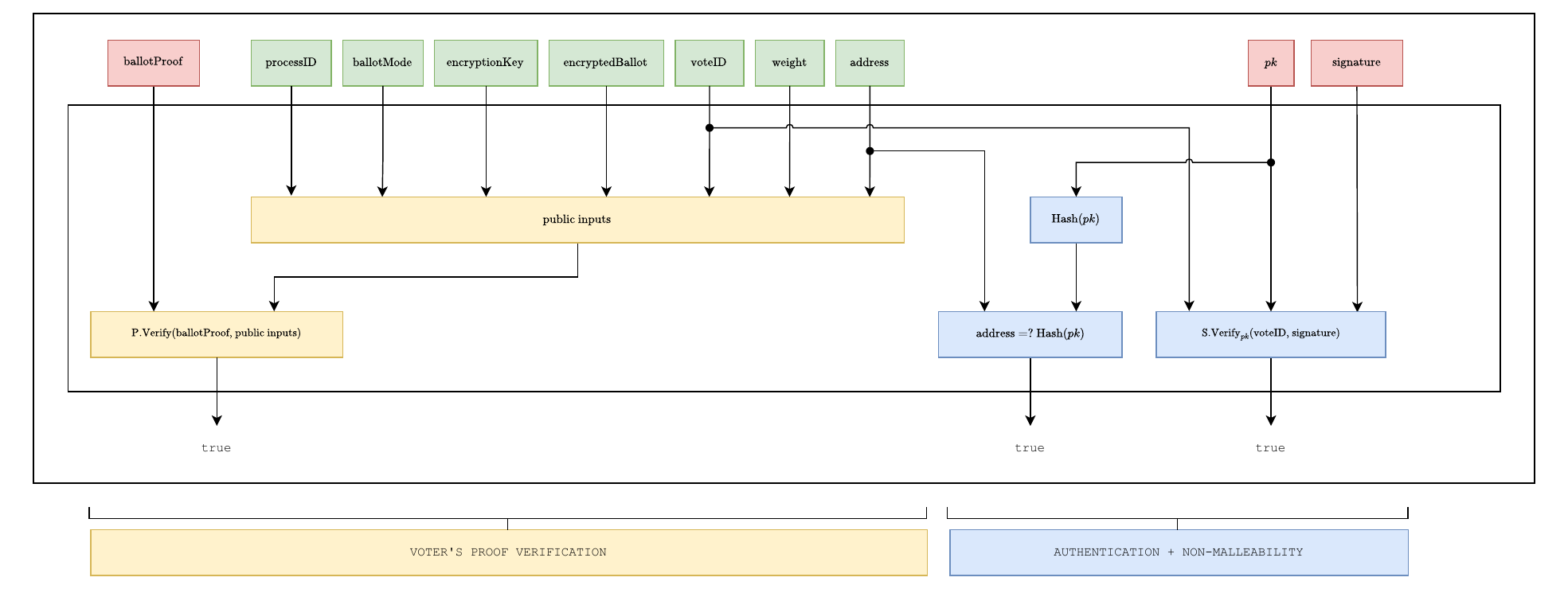 Zero-knowledge succinct non-interactive arguments of knowledge (ZK-SNARKs) are a crucial component in ensuring the integrity of the election. Voters generate ZK-SNARK proofs to demonstrate that their encrypted ballots comply with the rules and constraints defined by the election parameters, without revealing any information about their choices. Similarly, sequencers produce proofs to certify the correctness of vote aggregation and state transitions throughout the protocol. `P.Prove`(), `P.Verify`(proof, PI) – pkey, vkey.