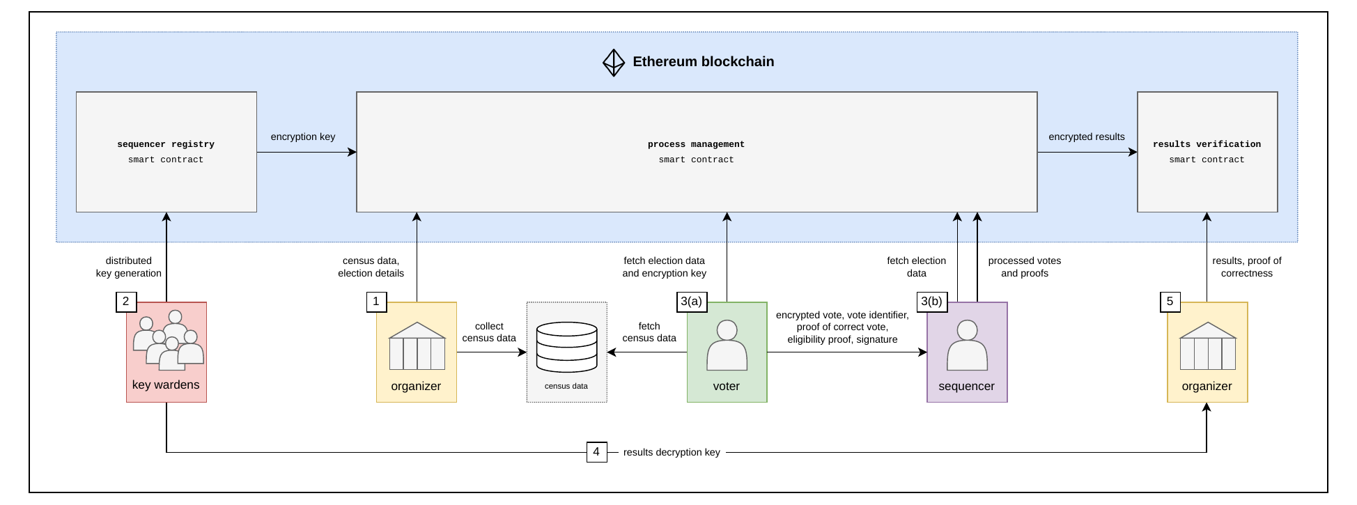 1.  *Election setup*. In the first phase, the *organizer* gathers all census data and generates a cryptographic commitment to this data. Additionally, the organizer defines the voting parameters, including the number of voting options and the vote-counting mechanism (e.g. weighted voting, quadratic voting, etc.). Once these details are set, the organizer submits a transaction to the process management smart contract on the Ethereum blockchain. This transaction publicly records the voting parameters and census commitment, ensuring transparency and preventing any subsequent alterations to the voting setup.
